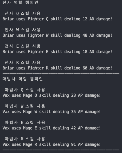 - 각 챔피언 객체가 실제로 어떤 타입(FighterChampion인지 MageChampion인지)에 상관없이, 공통된 메서드(championRole, useQ, useW, useE, useR)를 호출할 수 있습니다.