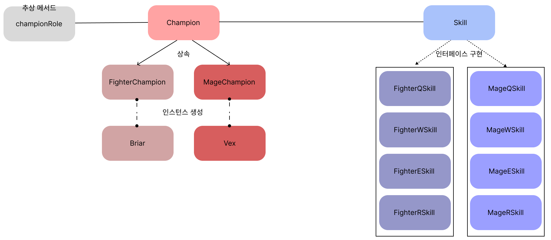 - FighterChampion과 MageChampion은 모두 Champion 클래스를 상속받습니다. Champion 클래스는 championRole, useQ, useW, useE, useR 메서드를 정의하고 있습니다.